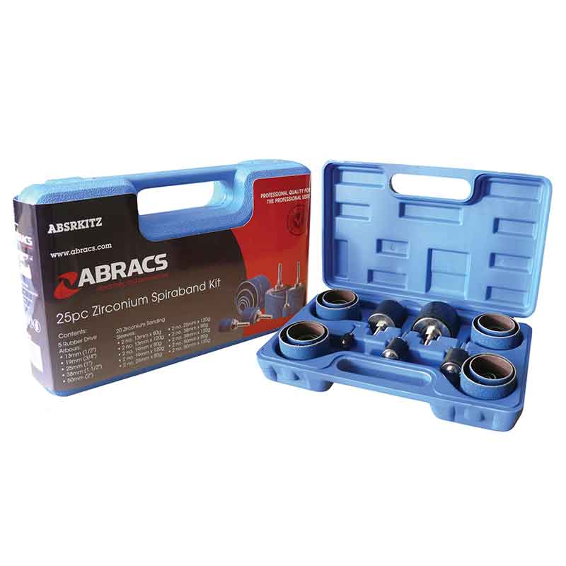 The Abracs 25pc Spiraband Kit includes a range of zirconium spirabands in various sizes, grits, and arbors, all packed inside a handy carry case. Designed for heavy-duty use, this multi-purpose kit is suitable for die grinders and drills, providing long life and versatility.