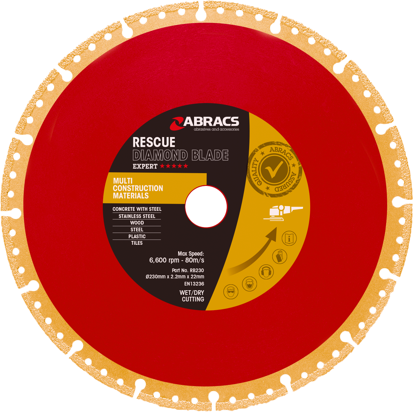 The ABRACS® 350mm x 20mm Rescue Blade includes premium quality diamonds vacuum brazed to a strengthened metal body, designed for high-performance cutting across various materials. Suitable for rescue work and general construction, it ensures excellent cutting speeds with minimal material loss due to its super thin blade. Compatible with 300mm petrol saws, it offers ultimate cutting performance for materials such as concrete, steel, wood, and more.