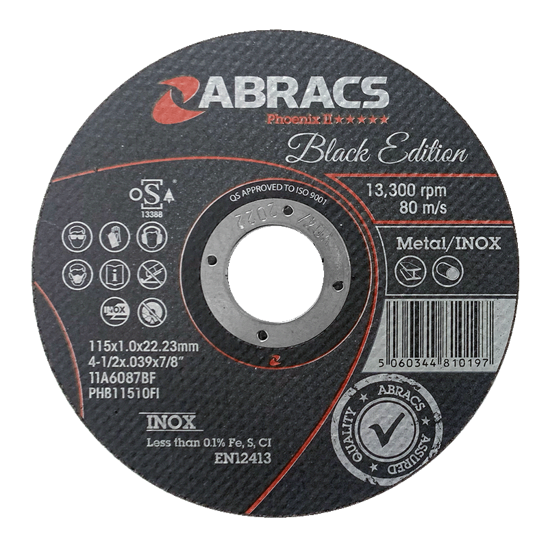 The ABRACS® Black Edition Extra Thin Phoenix II Cutting Disc includes strengthened webbing and integrated bore for compound stability, delivering smooth and low vibration INOX cutting. It is designed for high precision, exceptional speed, and controlled cutting for metal applications including Stainless Steel, Sheet metal, Mild Steel, and High Grade Steel. This disc is European manufactured and adheres to O.S.A safety standards, offering 30% extra performance compared to standard discs. Suitable for use with an angle grinder. This disc operates at a speed of 12,301 RPM at 80 m/s.