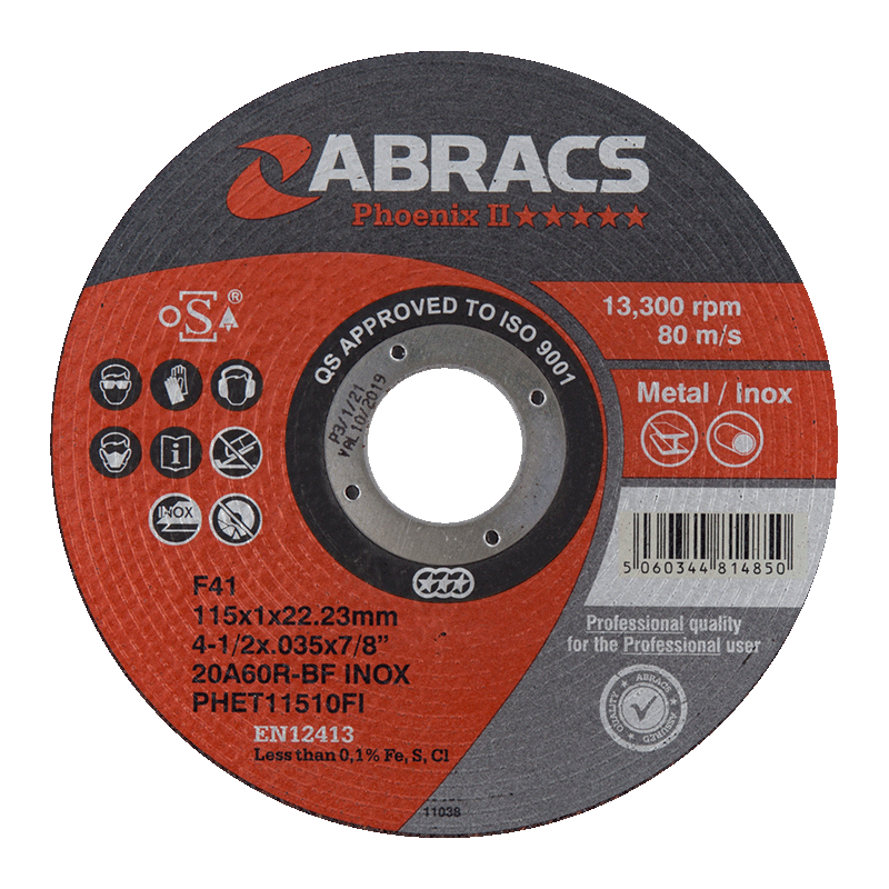 The ABRACS® Phoenix II Extra Thin Cutting Disc includes a superior quality European manufactured cutting disc designed for extremely fast and precise cutting. It is suitable for cutting sheet metal and various types of steel such as stainless steel, mild steel, and high-grade steel. The disc is strengthened for core stability, reducing vibration and improving cut consistency. Ideal for use with an angle grinder. The disc adheres to O.S.A Safety standards and is capable of operating at 6,600 rpm and 80m/s.