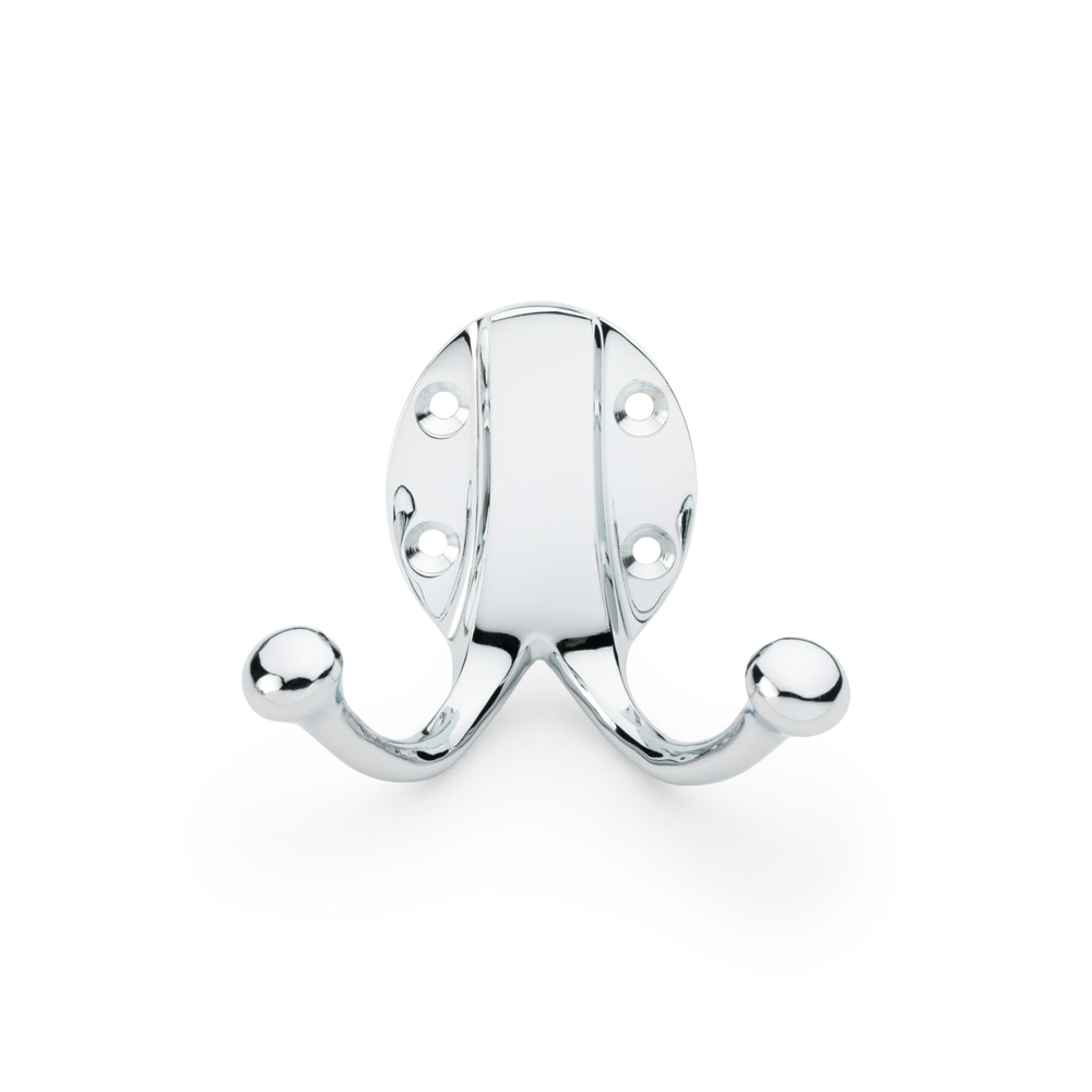 The Alexander & Wilks Traditional Double Robe Hook features an elegant oval backplate with four mounting points for secure installation. Crafted from high-quality brass with a luxurious polished chrome finish, this British-designed double hook combines classic styling with modern manufacturing precision. Perfect for hanging robes, coats, or towels, its robust construction and timeless design make it an excellent choice for both traditional and contemporary interiors. Each hook comes complete with matching domed head screws for a coordinated look.
