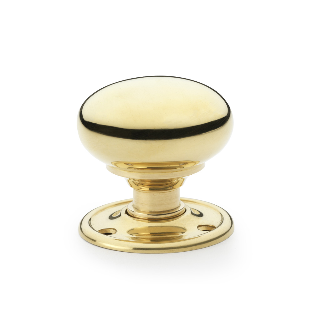 The Alexander & Wilks classic mushroom door knob features an exquisite traditional design crafted from solid brass with a polished brass unlacquered finish that develops a beautiful patina over time. The 51mm knob size provides a substantial feel, while the separate rose allows for versatile mortice or rim fixing with visible screws for easy installation. This unsprung door knob is perfect for both modern and traditional settings, offering timeless British design and exceptional craftsmanship. Supplied as a pair complete with spindle and matching screws.