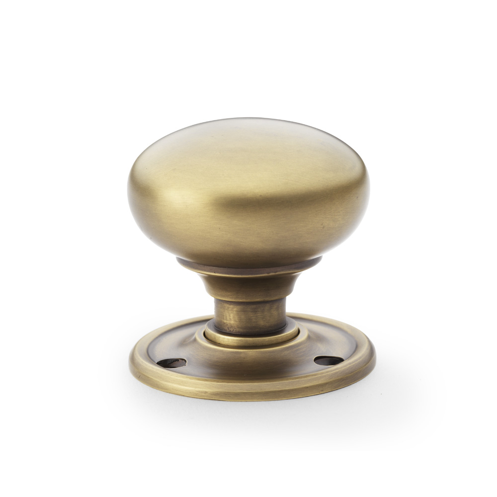 The Alexander & Wilks classic mushroom door knob features an exquisitely crafted traditional design made from solid brass with a beautiful antique brass finish. This unsprung 51mm door knob comes with a separate rose for flexible mortice or rim fixing, complete with visible screws for easy installation. Each pair includes matching spindle and screws. The timeless design suits both modern and traditional settings, with the antique brass finish developing a beautiful patina over time.