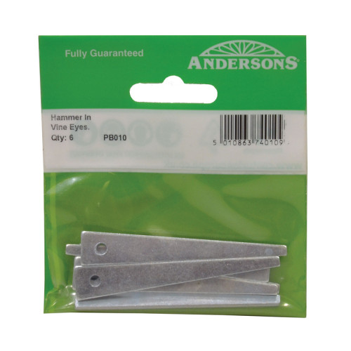 The ANDERSONS 75mm Drive In Steel Vine Eyes are zinc plated steel fixings designed for securing training wires, clothes lines, and supporting climbing plants. These durable vine eyes can be driven into timber, masonry, and walls to provide secure anchor points. The zinc plating offers enhanced rust resistance, making them suitable for outdoor use in garden applications.
