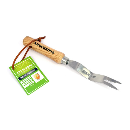 The ANDERSONS Stainless Steel Hand Weeder is a premium quality garden tool featuring a mirror polished stainless steel head and comfortable hardwood handle with leather strap. Designed for effective weed removal, this durable tool offers excellent rust resistance and minimal soil adhesion, making it perfect for levering short-rooted weeds from their roots. The ergonomic design ensures comfortable and efficient garden maintenance.