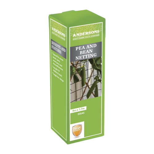 The ANDERSONS Pea and Bean Netting is a versatile garden support solution measuring 4m x 1.7m, specifically designed for climbing plants including runner beans, peas, sweet peas and chrysanthemums. This UV-stabilized mesh features a tangle-free design for easy handling and ensures long-lasting durability even under direct sunlight exposure. The practical dimensions make it ideal for both small and medium-sized garden applications.