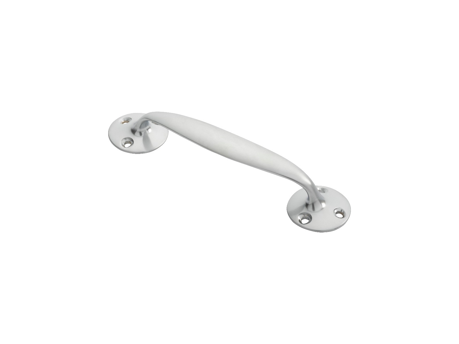 The CARLISLE BRASS® Victorian Bow Handle is a cast one-piece curved handle that blends into rounded roses. It features three anchor points on each rose for a secure fixing. The classic face-fixed pull handle with a sweeping bow pull makes it perfect for use in commercial settings as well as residential. The handle has a satin chrome finish and is designed to be durable and stylish.