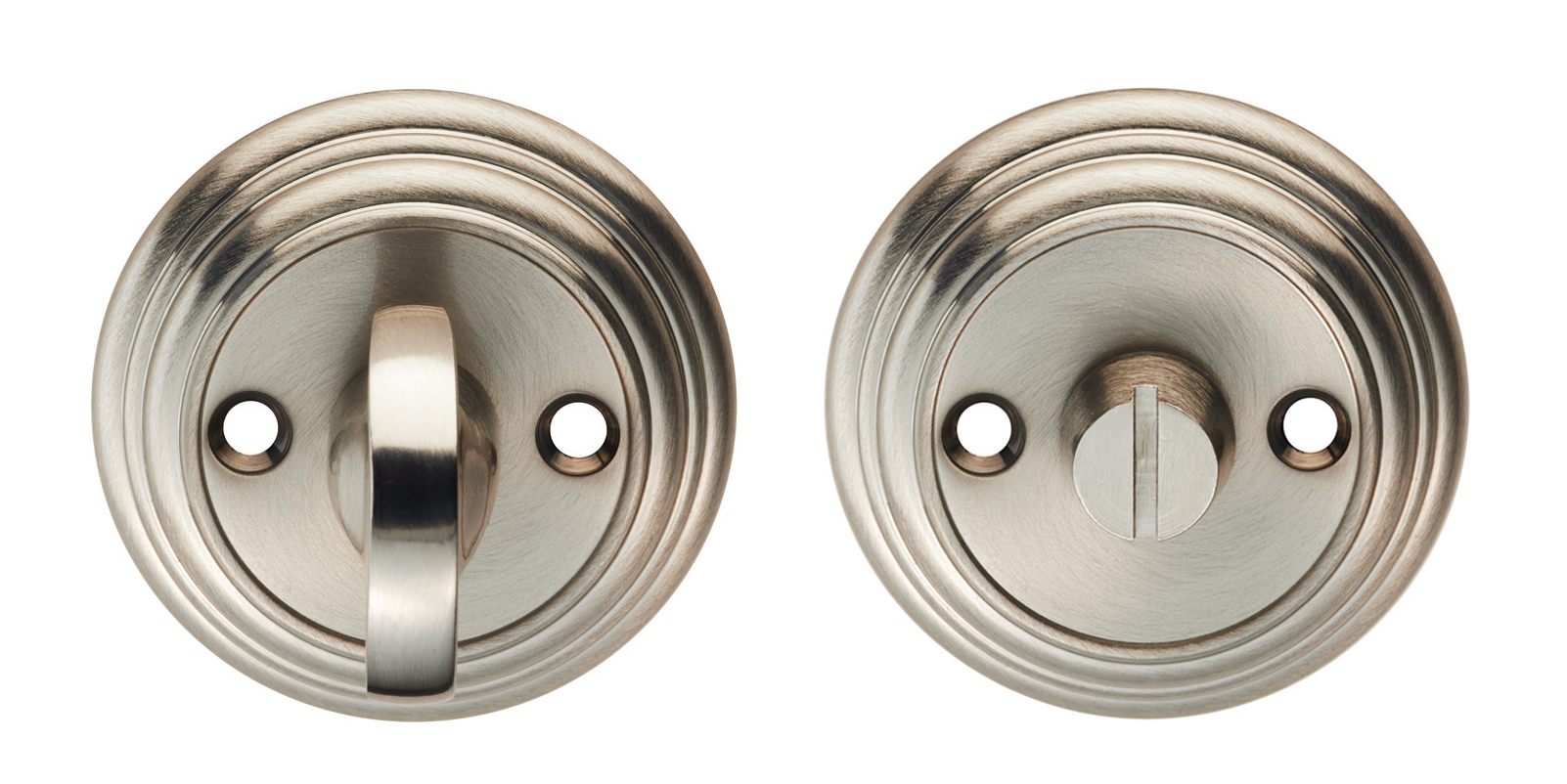 The CARLISLE BRASS® Delamain turn & release on round rose is a bathroom turn and release set designed to complement the Delamain door knob range. It requires the use of a separate deadbolt for proper function. The set is face fix and has a satin nickel finish. The spindle measures 4.9mm x 67mm, and the overall size of the set is 55mm. This product comes with a 10-year mechanical guarantee, ensuring longevity and reliable use.