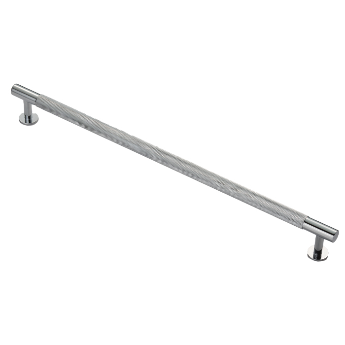 The CARLISLE BRASS® knurled cabinet pull handle is part of the knurled cabinet collection offered by Carlisle Brass. Engineered from solid brass, this polished chrome pull handle adds texture and a contemporary industrial design to any space. It is suitable for various interior design styles, including industrial, modern, transitional, and contemporary. The handle is precision-engineered for durability and style, with a matching cupboard knob and T Bar cupboard knob available in the collection.