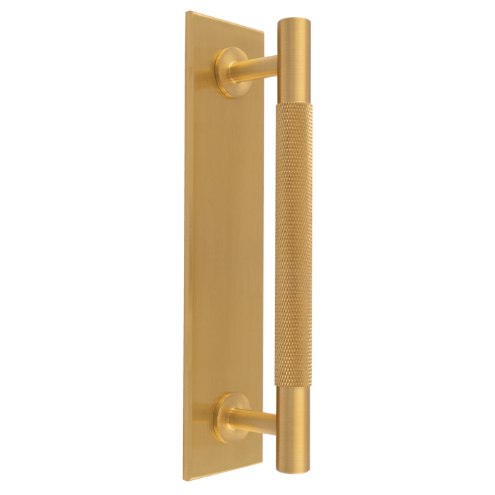 The CARLISLE BRASS® knurled pull handle on backplate is a harmonized design piece that brings an iconic industrial aesthetic. This pull handle is available in different variations with backplate options of 168mm x 40mm and 200mm x 40mm, allowing for either a 128mm or 160mm handle. The knurled texture adds depth and grip, and this detail shines through in the satin brass finish. Made from solid brass, this precision-engineered handle is versatile and works seamlessly with various interior design styles, including industrial, modern, transitional, and contemporary. Matching cupboard pull handles and knobs are also available to complete the set.
