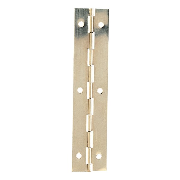 The CARLISLE BRASS® 1830 x 38 x 1mm piano hinge, provided in a 50 pack, is a versatile continuous hinge originally designed for securing piano lids. These hinges, also known as continuous hinges, measure 1.8 meters in length and can be cut to fit the required size. They are ideal for providing solid support along extended lengths on various openings. The nickel-plated finish offers a sleek appearance and corrosion resistance, making it suitable for domestic use. The hinges come with a 10-year mechanical guarantee.