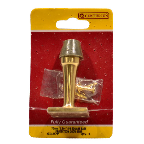 The Centurion Square Base Projection Door Stop includes a robust 70mm projection arm with a rubber tip designed to protect walls, paintwork and plaster from door and handle damage. Featuring a polished brass finish and square base mounting plate, this door stop effectively prevents door slamming while the rubber buffer dampens noise for quiet operation.