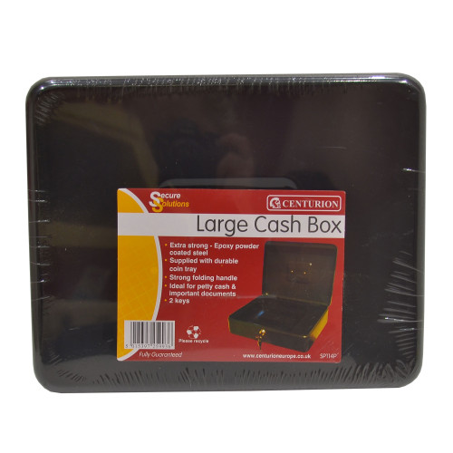 The Centurion Large Cash Box is a robust security solution featuring extra-strong epoxy powder-coated steel construction. This practical cash box includes a durable coin tray, strong folding handle, and comes with 2 keys for secure access. Perfect for managing petty cash, important documents, and valuables in business, event, or school settings. The organized design includes a dedicated coin section and a lower compartment for notes and valuable items.
