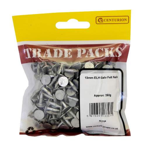 The CENTURION 13mm Extra Large Head Galvanized Felt Nails are specially designed for securing roofing felt and insulation boards. The large head design effectively distributes load to ensure roofing felt remains firmly secured. These nails feature galvanized protection for enhanced durability and corrosion resistance, making them ideal for various joinery, construction, and roofing applications. Supplied in a convenient 250g pack.