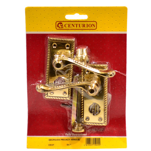 The Centurion Georgian Privacy Handle Set features an elegant traditional design in solid brass with decorative backplates measuring 100mm x 45mm. Perfect for bathroom and bedroom doors, this set includes a convenient twist-turn privacy latch mechanism. The handles are corrosion-resistant and come complete with all required fixings, making them ideal for internal residential and commercial applications.