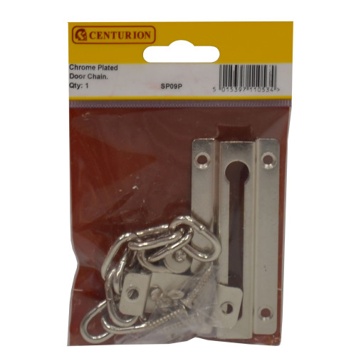 The CENTURION Chromed Steel Door Chain provides essential door security, allowing residents to partially open their door to verify visitors before granting full access. This lockable chrome-finished door chain features an 85mm opening range and includes all necessary mounting hardware. Perfect for wooden doors, it offers protection against force attacks while maintaining convenience for daily use.
