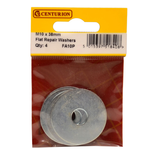 The Centurion M10 x 38mm Zinc Plated Flat Repair Washers are designed to provide enhanced load distribution when used with nuts and fasteners. These washers are particularly useful for repair work where small-headed fasteners have pulled through material, offering a smooth bearing surface and improved load spreading capability. The zinc plated finish provides good corrosion resistance for longer service life.