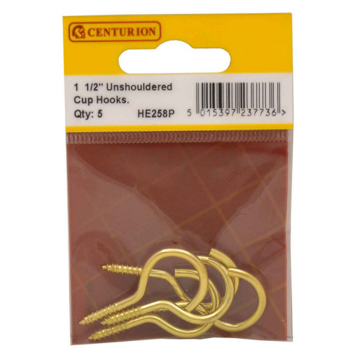 The CENTURION 40mm Unshouldered Cup Hooks are versatile brass fixings ideal for use in kitchens, garages, and sheds. These unshouldered hooks feature a design that allows deeper penetration into wood surfaces without obstruction, making them perfect for hanging keys, cups, jewelry, and various other items. The brass finish offers both durability and aesthetic appeal.