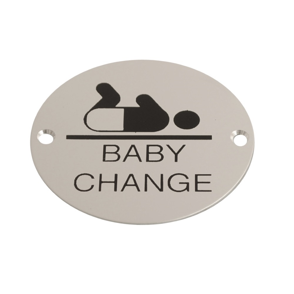 The CORE-BULK Disc Screen Printed Baby Change SAA 76mm is a sign designated for facilities that provide baby changing services. This satin aluminium finish sign boasts a circular shape with clear pictorial representation of the baby changing facility. It comes complete with two mounting holes for easy installation.