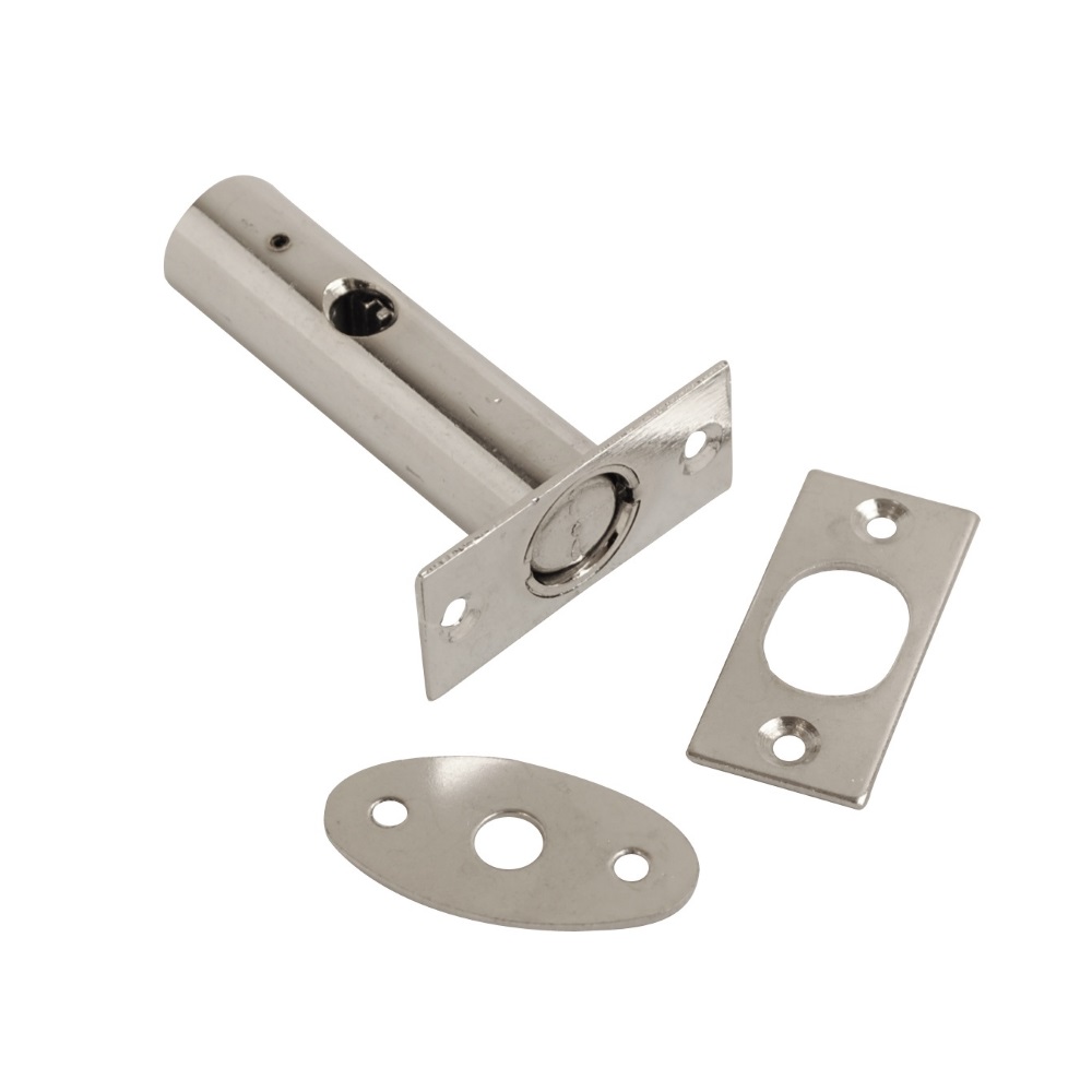 The CORE-BULK CP Door Security Bolt is designed to enhance the security of interior doors. It measures 2.3/8 inches, making it suitable for various door thicknesses. Included in the package are the main bolt mechanism, a small faceplate that attaches to the door frame, and a striking plate, likely to be installed on the jamb where the bolt slides in to secure the door. The polished chrome plated finish provides a sleek, modern look while offering durability and corrosion resistance.