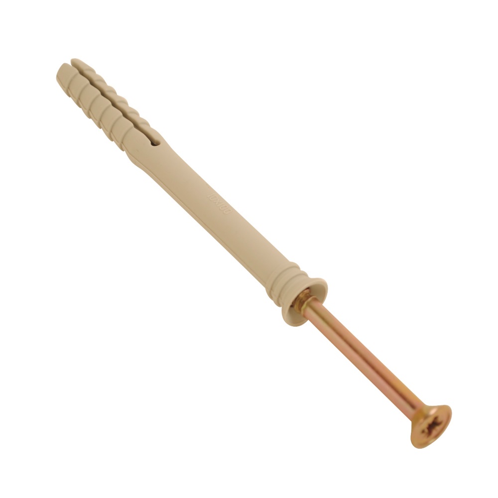 The CORE-BULK Hammer Fixing M8x80mm is a fastening solution designed for securing objects into a substrate such as masonry, concrete, or wood. The product features a serrated shaft that ensures a better grip within the drilled hole, and it comes with a zinc and yellow plated finish for corrosion resistance. The M8 diameter and 80mm length indicate its size for various anchoring applications.
