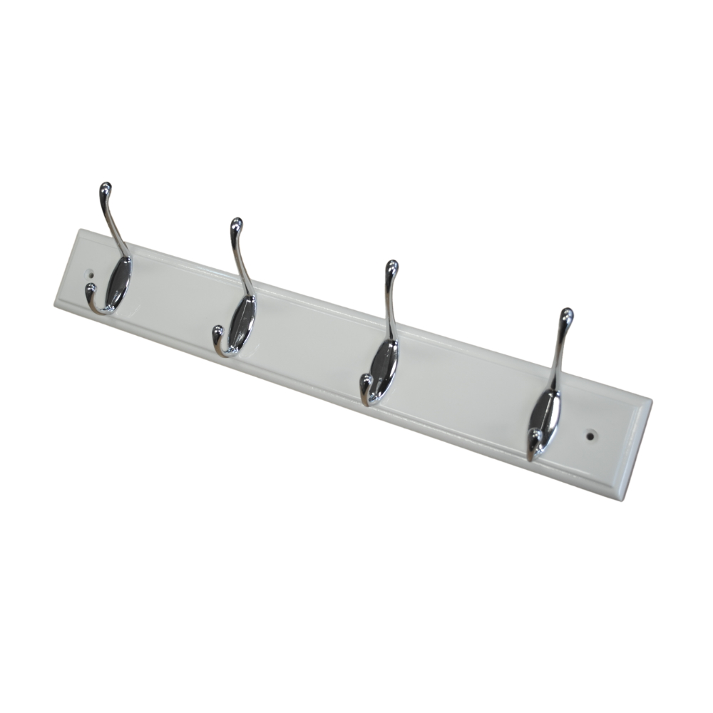 The CORE-BULK Hat & Coat Rack White – 4 hook CP is an elegant and functional wall-mounted rack designed to hold hats and coats. It features a sleek white backing with four polished chrome-plated hooks that provide a modern and stylish look. The rack is suitable for use in various settings such as homes, offices, and dressing rooms, offering convenient storage and easy access to clothing items.