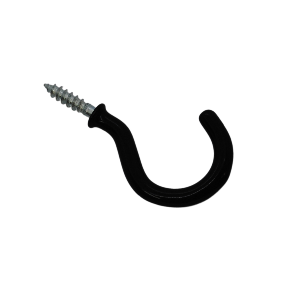 This part is the CORE-BULK Shouldered Cup Hook in black PVC with a size of 38mm. It is designed for hanging items securely and can easily be screwed into various surfaces thanks to its threaded end. The hook features a stylish shoulder that helps keep hung items stable and can be used in a variety of settings, both for functionality and decorative purposes.