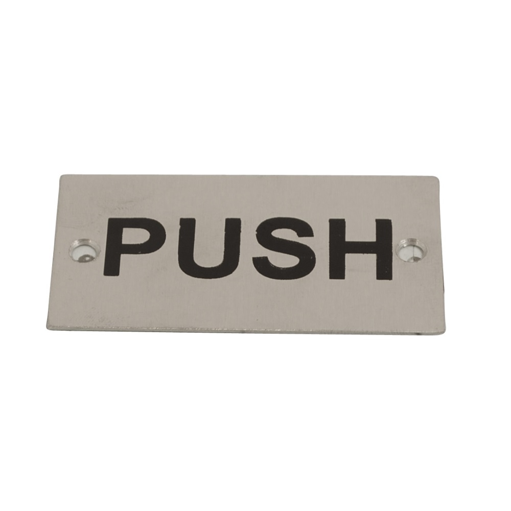 The CORE-BULK Sign Screen Printed Push SSS 75x40mm is a door sign with the word PUSH clearly displayed in black text on a rectangular satin stainless steel plate. This sign is commonly used to indicate a push mechanism on doors in commercial or residential settings. The size of the plate is appropriately dimensonal for visibility and subtlety, measuring 75x40mm.