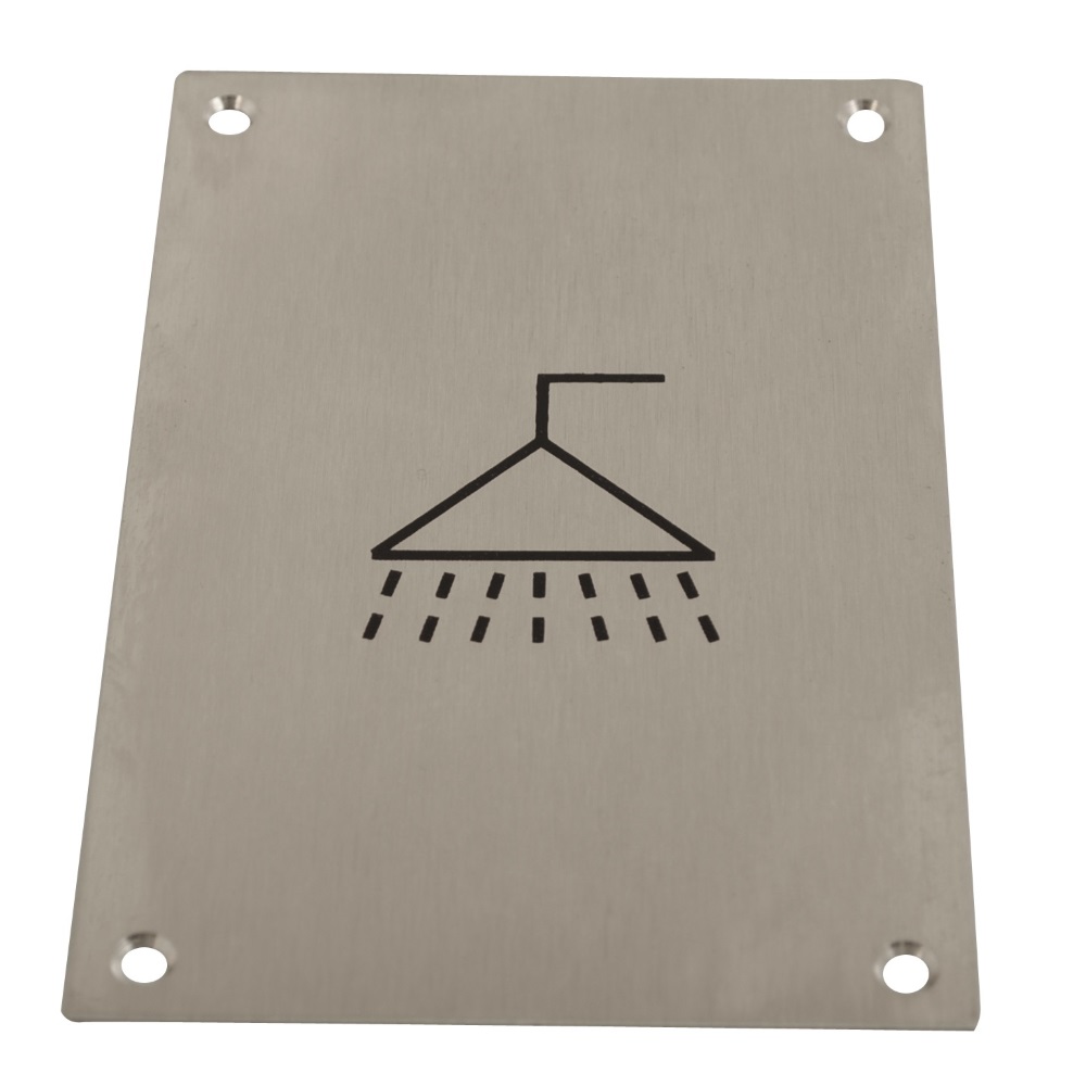 The CORE-BULK Sign Screen Printed Shower SSS is a sleek and contemporary signage plate intended to indicate shower facilities. The screen-printed icon features a stylized depiction of a shower, simplifying identification for users. Its satin stainless steel finish provides a modern touch that complements various interior designs while ensuring durability.