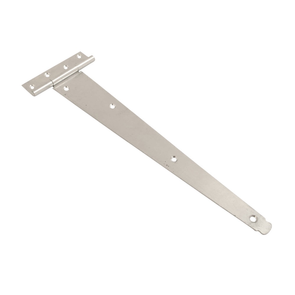 This component is a medium-sized tee hinge, commonly used to hang doors, gates, or other pivoting objects that require reliable support and smooth operation. At 300mm in length, it supports medium-weight installations, and the Bright Zinc Plated (BZP) finish adds a layer of corrosion resistance making it suitable for both indoor and outdoor applications. The hinge features four evenly spaced screw holes on the mounting plate for secure attachment and a single elongated hole at the end of the arm for adjustability and alignment during installation.