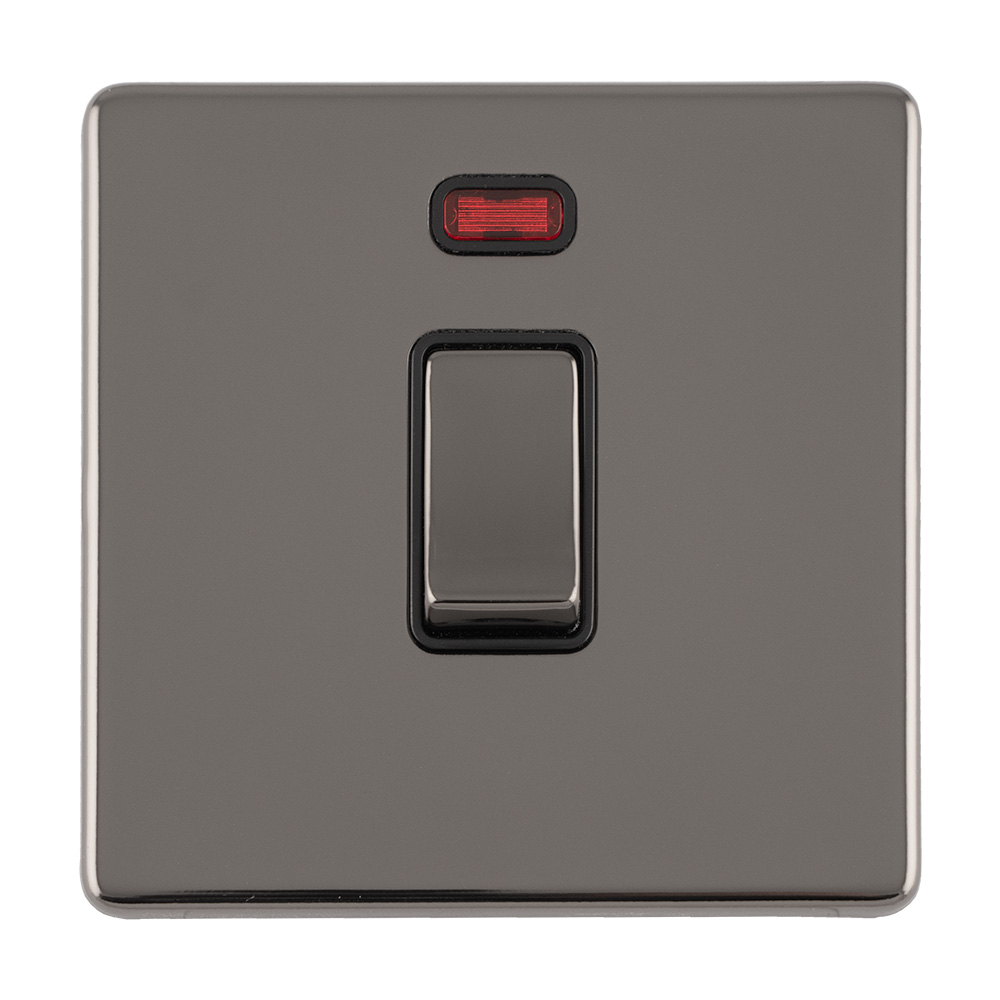 The EUROLITE® Concealed 3mm 1 Gang 20Amp Double Pole Switch features a sophisticated black nickel finish with matching black rocker switch and red neon indicator. This high-capacity switch is designed for controlling high-power electrical circuits up to 20 amps, making it ideal for appliances or lighting circuits requiring robust switching. The concealed fixing design creates a sleek, modern appearance with a slim 3mm profile that sits elegantly against the wall.
