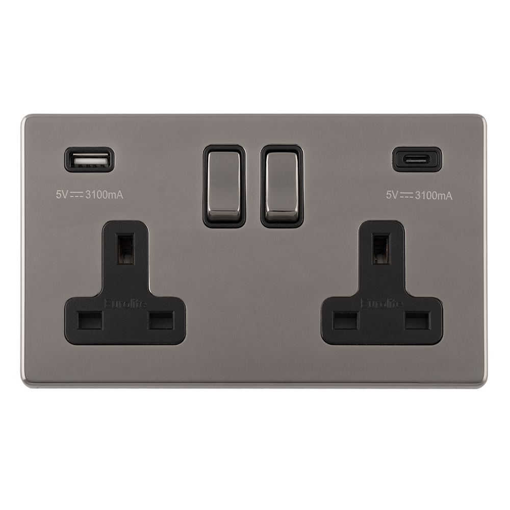 The EUROLITE® Concealed 3mm 2 Gang USBC Socket features a modern and sleek design with two 13-amp power outlets and integrated USB charging capabilities. It includes one USB Type-A and one USB Type-C port, each providing 5V/3.1A output for fast device charging. The socket features a premium black nickel finish with black rockers and faceplates, offering a sophisticated and contemporary appearance that complements modern interiors. The concealed 3mm design ensures a slim, flush fit against the wall for a minimalist aesthetic.