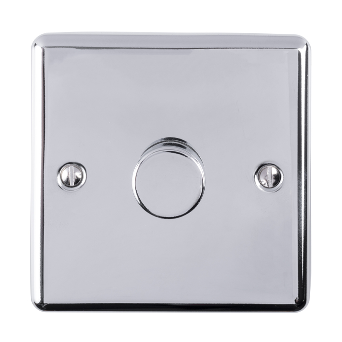 The EUROLITE® Enhance Decorative 1 Gang Dimmer features a sleek polished chrome finish that adds a touch of sophistication to any room. This versatile 400W dimmer switch is LED compatible and offers 2-way switching capability, allowing you to control your lighting from multiple locations. The elegant Enhance range design includes a stylish square faceplate with a smooth circular dimmer control and perfectly matched mounting screws.