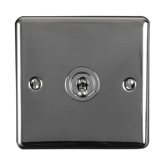 The EUROLITE® Enhance Decorative 1 Gang Toggle Switch features an elegant black nickel finish with a stylish black trim, offering both functionality and aesthetic appeal. This 10 Amp 2-way toggle switch is part of the premium Enhance Range, designed to add a sophisticated touch to any interior. The switch plate comes with a sleek, modern design complemented by visible mounting screws that add to its industrial-chic appearance.