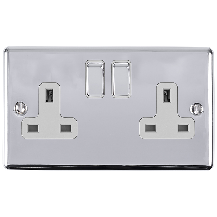 The EUROLITE® Enhance Decorative 2 Gang Socket features a stylish polished chrome finish with contrasting grey trim, offering a modern and sophisticated appearance. This 13-amp double-pole switched socket provides two independent power outlets with individual switches for convenience and safety. Part of the premium Enhance Decorative range, this socket combines functionality with elegant design, making it perfect for both contemporary and traditional interiors.