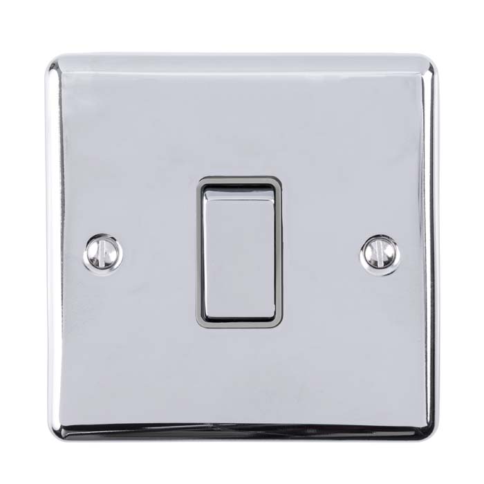 The EUROLITE® Enhance Decorative 20Amp Switch features a premium polished chrome finish with a contemporary grey trim. This high-capacity single gang double pole switch is designed for controlling high-power appliances and circuits up to 20 amps. The sleek, modern design combines functionality with aesthetic appeal, featuring a durable faceplate with easy-access mounting screws.