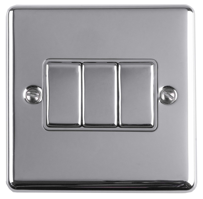 The EUROLITE® Enhance Decorative 3 Gang Switch features a luxurious polished chrome finish with a contemporary grey trim, offering both style and functionality. This 10-amp, 2-way switch plate includes three independent switches and is part of the premium Enhance Decorative range. The high-quality finish and robust construction make it an elegant choice for modern interior settings, combining practical electrical control with sophisticated design elements.