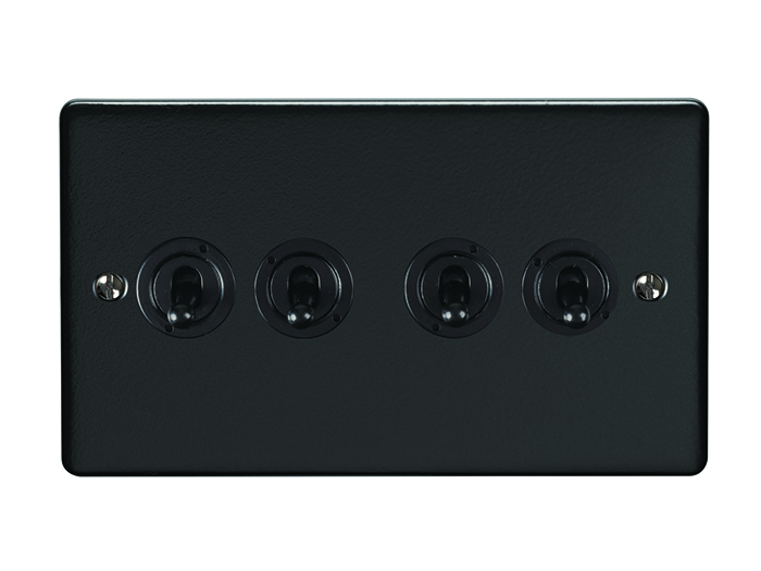 The EUROLITE® Enhance Decorative 4 Gang Toggle Switch features a sophisticated matt black finish that adds a modern, minimalist touch to any interior. This high-quality electrical fitting includes four individual toggle switches mounted on a sleek flat plate with matching black toggles. The plate is secured with two visible screws for easy installation and maintenance. Part of the premium Enhance Decorative range, this switch plate combines functionality with contemporary styling, perfect for both modern and traditional interiors.