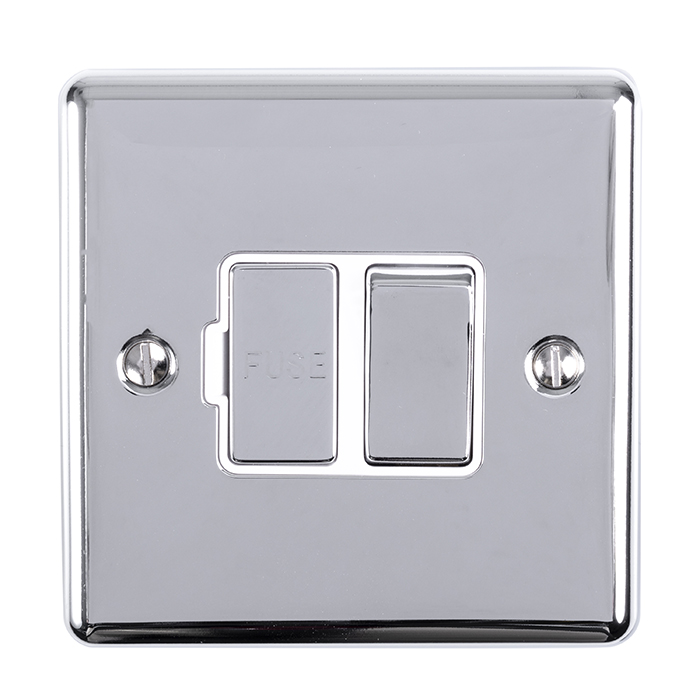 The EUROLITE® Enhance Decorative Switched Fuse Spur combines functionality with elegant design, featuring a polished chrome finish with contrasting white trim. This 13 Amp double pole switched fuse spur is part of the premium Enhance Range, offering a sophisticated solution for electrical installations. The high-quality polished chrome faceplate provides a modern, reflective finish that complements contemporary interiors while maintaining practical functionality.