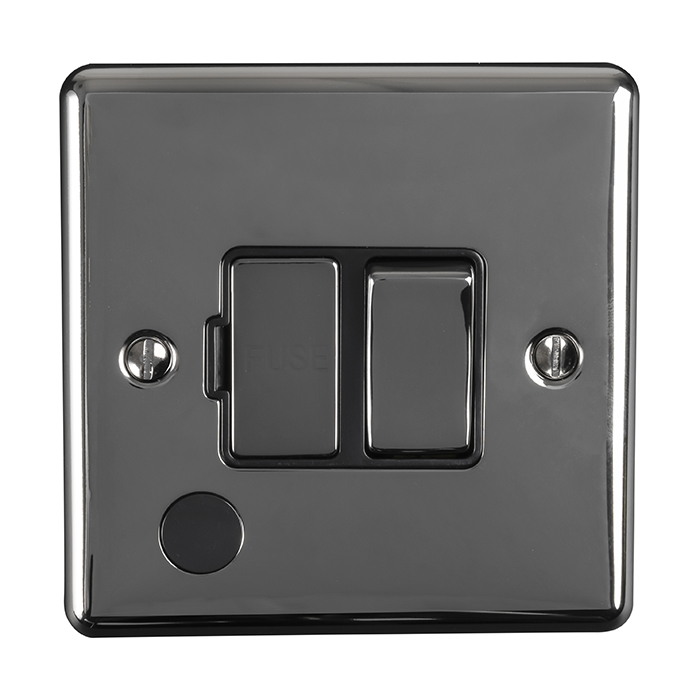 The EUROLITE® Enhance Decorative Switched Fuse Spur features a sophisticated black nickel finish with contrasting black trim, offering both functionality and style. This 13 amp double pole switched fuse spur includes a convenient flex outlet and is part of the premium Enhance Range. The unit comes complete with mounting screws and provides a modern, elegant solution for switched fused connections in any interior setting.