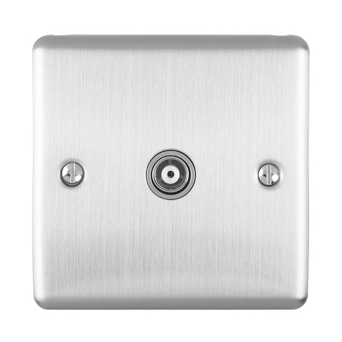 The EUROLITE® Enhance Decorative TV socket features a premium satin stainless steel finish with complementary grey trim, offering a sophisticated and modern appearance. This single gang TV coaxial socket provides reliable connectivity for television signals while maintaining an elegant aesthetic suitable for both contemporary and traditional interiors. The brushed metal finish helps conceal fingerprints and maintains its appearance over time, while the secure mounting screws ensure stable installation.