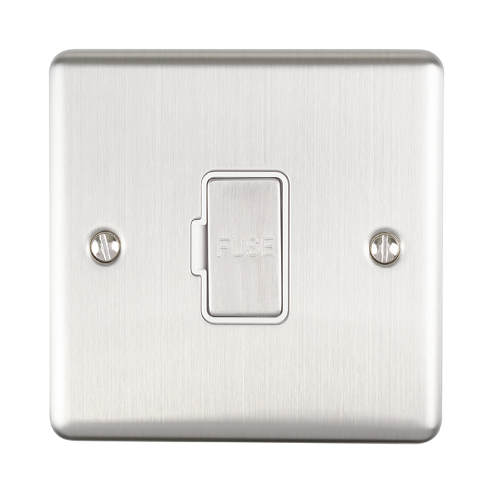 The EUROLITE® Enhance Decorative Unswitched Fuse Spur features a sophisticated satin stainless steel finish with contrasting white trim, offering a contemporary and stylish appearance. This 13 amp fuse spur provides reliable power connection for fixed appliances, with a clearly marked fuse holder for easy maintenance. The faceplate includes high-quality mounting screws and offers a premium feel with its brushed metal surface.