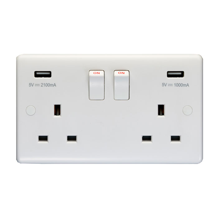 The EUROLITE® Enhance White Plastic 2 Gang USB Socket features two standard UK 13A power outlets with independent switches and convenient built-in USB charging ports. The dual USB ports provide a combined 3.1A output (2100mA + 1000mA) for efficient charging of mobile devices. This modern socket unit combines functionality with a clean white finish that complements any interior.