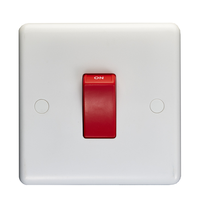 The EUROLITE® Enhance 45Amp double pole switch features a clean white plastic faceplate with a contrasting red rocker switch marked ‘ON’ for clear operation indication. This high-capacity switch is designed for controlling heavy-duty electrical appliances and circuits up to 45 amps. The modern, minimalist design includes a smooth white finish that complements contemporary interiors while maintaining professional functionality.
