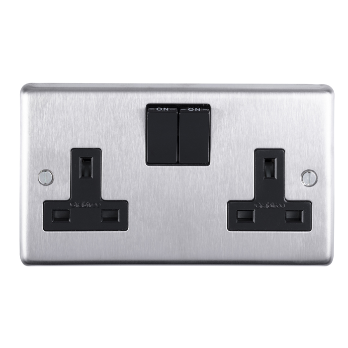 The EUROLITE® 2 Gang Socket features a premium satin stainless steel faceplate with contrasting black switches and socket outlets. This modern double socket provides two 13 amp power outlets with independent switches, perfect for both residential and commercial installations where a sophisticated, durable finish is desired. The round-edged design and brushed steel finish offers both style and practicality, while the black trim provides an elegant accent that works well in contemporary settings.