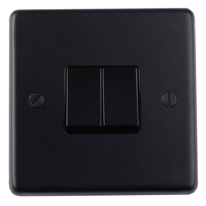 The EUROLITE® 2 Gang Switch features a sophisticated matt black finish with matching black rockers, offering both style and functionality. This 10 Amp 2-way switch comes with a round-edged faceplate that provides a modern, sleek appearance. The switch is designed for easy installation with its standard mounting system and is ideal for both residential and commercial applications where a premium black finish is desired.