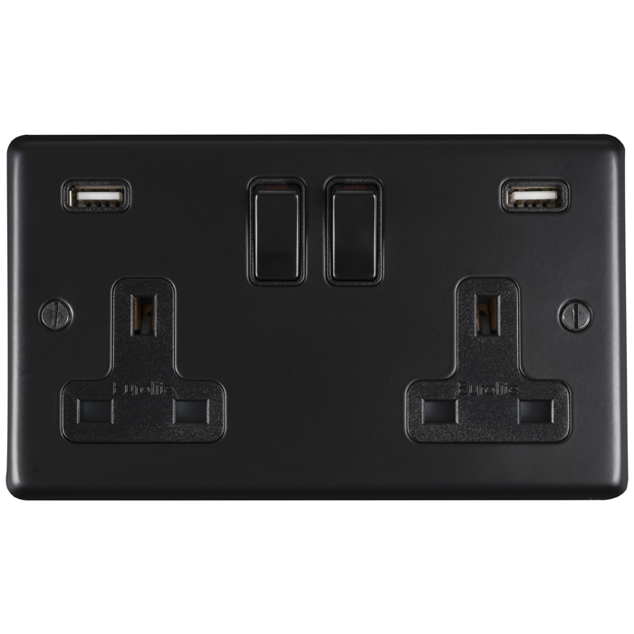 The EUROLITE® 2 Gang USB Socket features a sophisticated matt black finish with matching black trim, combining modern functionality with elegant design. This versatile socket includes two 13-amp power outlets and two integrated USB ports delivering a combined 4.8 amps, perfect for charging mobile devices. The round-edged faceplate provides a sleek, contemporary look while maintaining practical functionality for both standard electrical devices and USB-powered equipment.