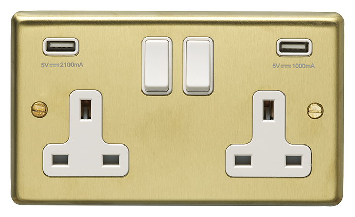 The EUROLITE® Stainless Steel 2 Gang USB Socket combines modern functionality with elegant design, featuring a luxurious satin brass finish with white trim. This versatile socket includes two 13-amp switched outlets and two USB charging ports delivering up to 4.8 amps combined (2100mA + 1000mA), perfect for charging mobile devices while maintaining traditional power access. The round-edged faceplate offers a sophisticated appearance suitable for both contemporary and traditional interiors.
