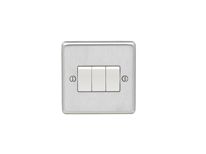 The EUROLITE® 3 Gang Switch features a premium satin stainless steel finish plate with elegant white rocker switches. This 10Amp 2-way switch unit offers both style and functionality with its modern round-edge design. The combination of brushed stainless steel surround and crisp white switches creates a sophisticated appearance suitable for both contemporary and traditional interiors. The unit is rated at 10 Amps making it suitable for most domestic lighting applications.