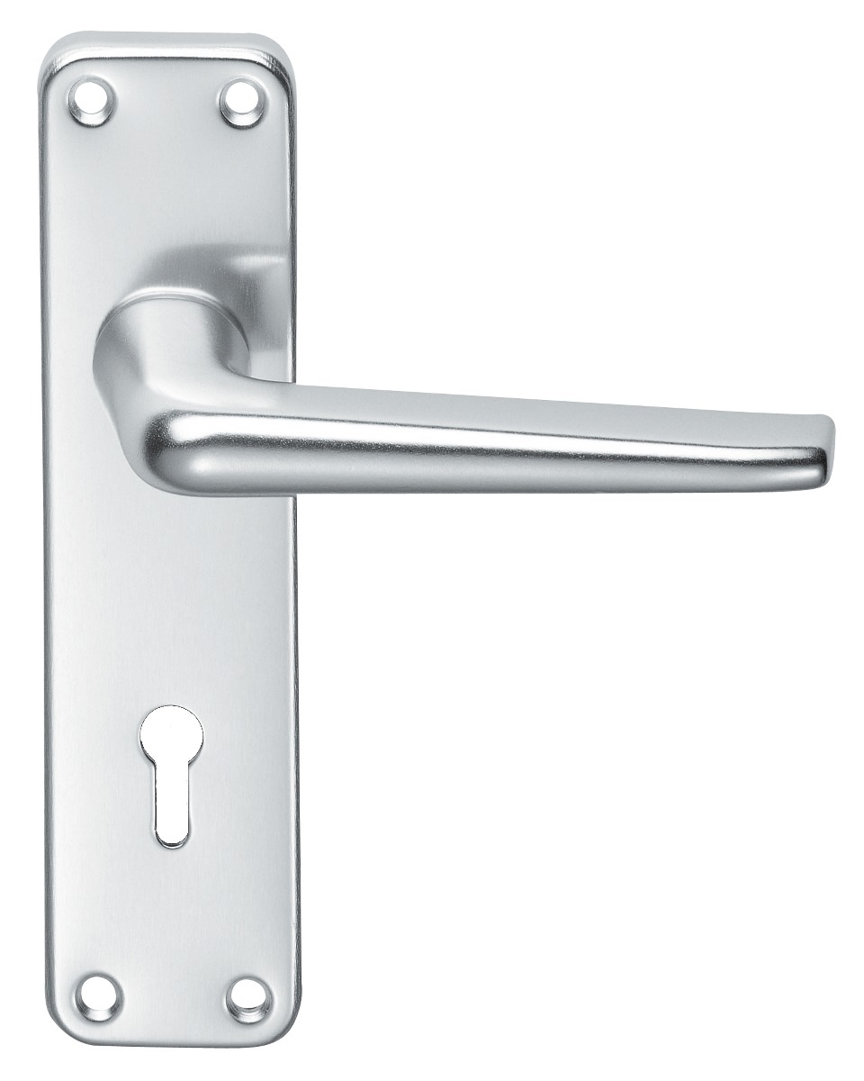 The EUROSPEC® aluminium lever on backplate is a contract lever designed for efficient installation. It features a slender straight lever tapering slightly towards the end, set on a rectangular face-fix backplate. The lever has a center-to-center lock measurement of 57mm. This handle is ideal for contract specifications and comes with a 10-year mechanical guarantee. It is a fire door rated product and a part of the Aluminium range, which assures it meets rigorous standards.